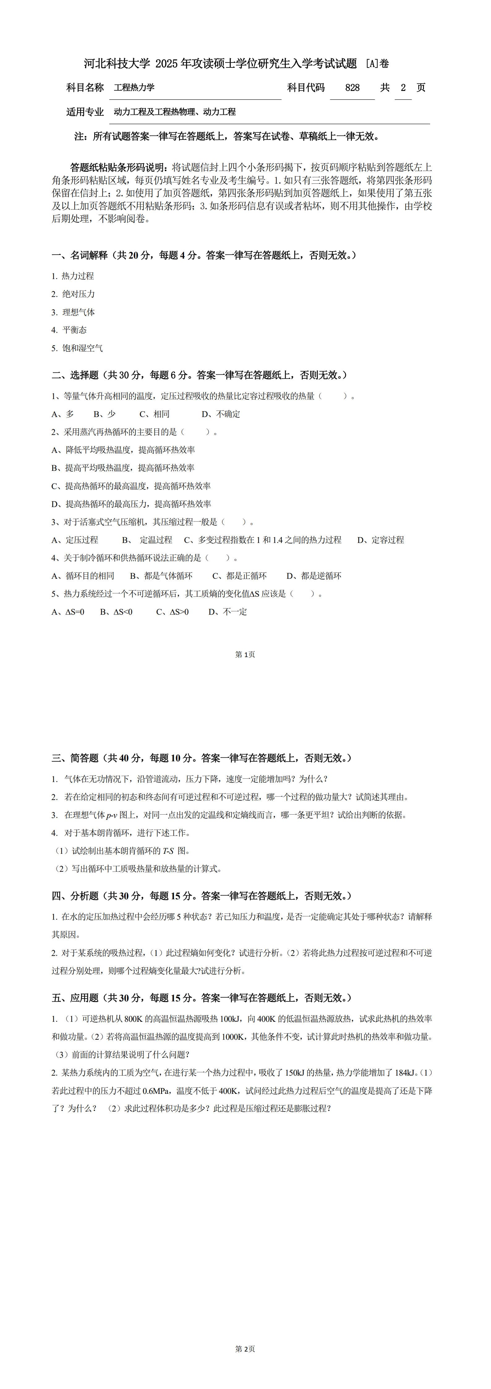 828工程热力学试卷A