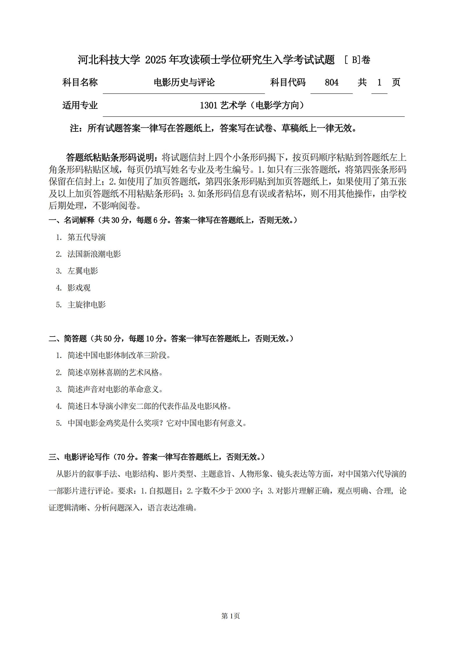 804电影历史与评论B卷