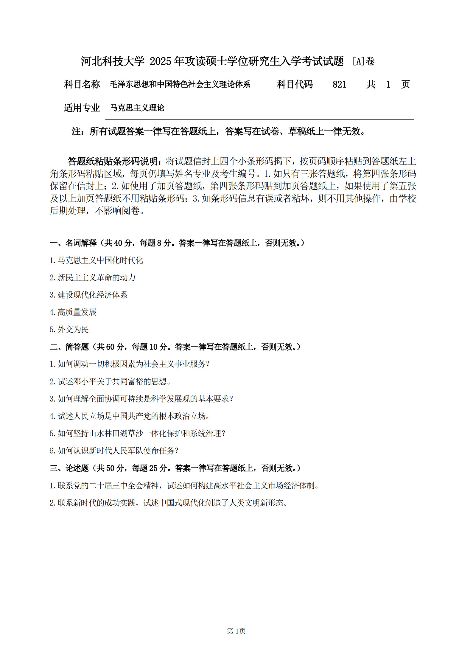 821毛泽东思想和中国特色社会主义理论体系(A卷)
