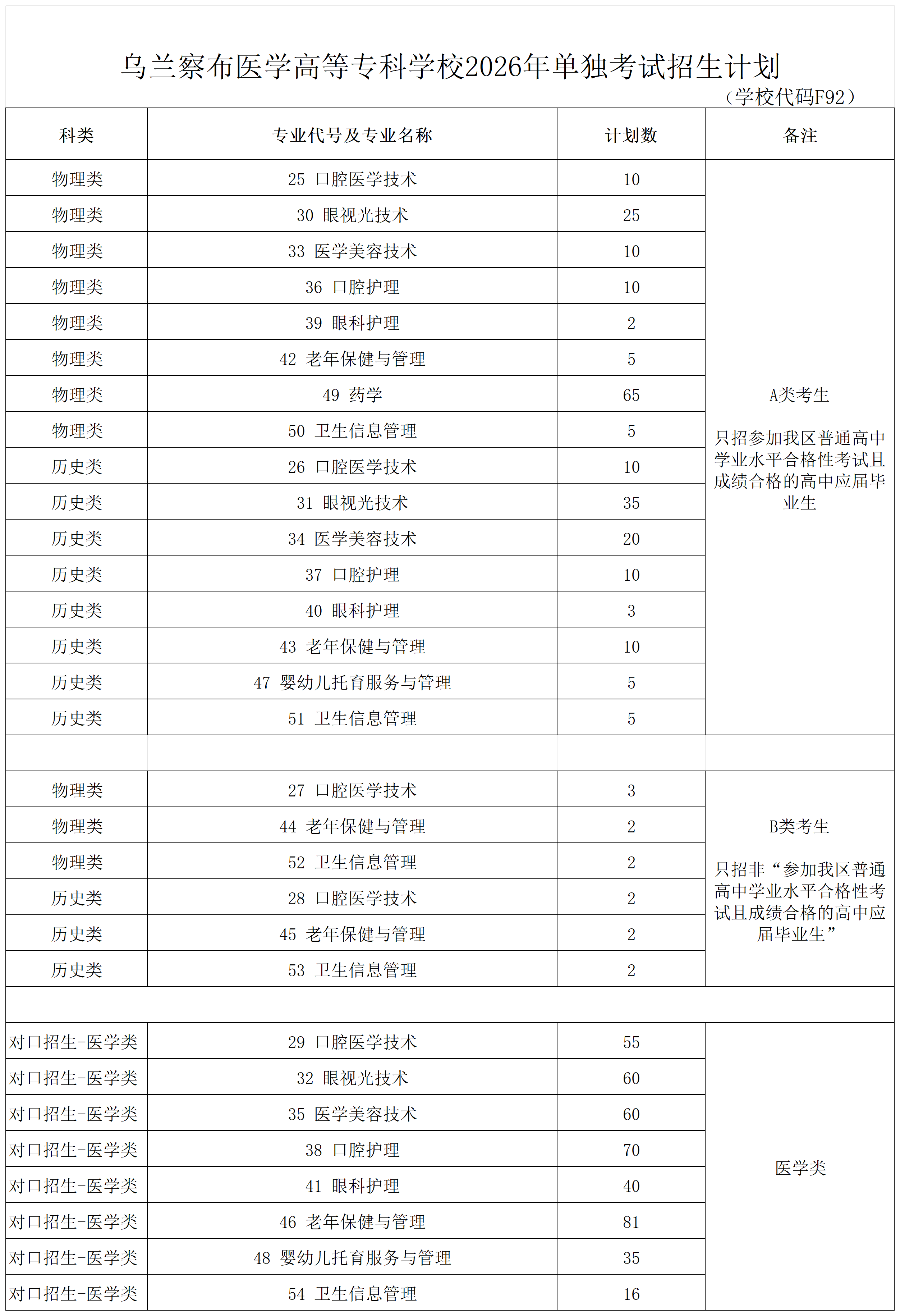 2026年单独考试招生专业计划表