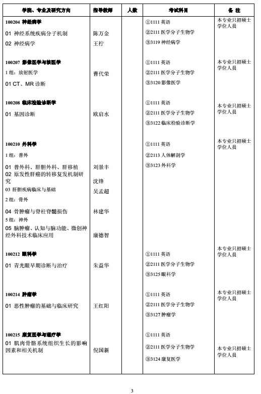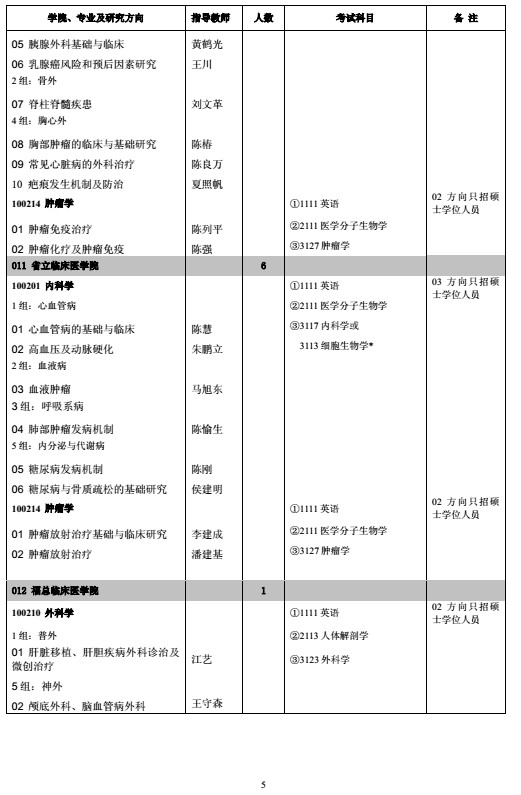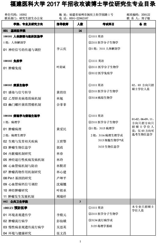福建医科大学 2017 年博士研究生招生专业目录