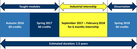 本课程以授课为基础, 学生完成120个学分的课程后, 要参加6个月的工业实习(不计学分)。在工业实习中, 学生将根据自己的兴趣探索某一研究课题,在实习结束后以此为基础开展相关课题的研究并撰写论文。课题研究及论文为60个学分, 在第二年春季开始。