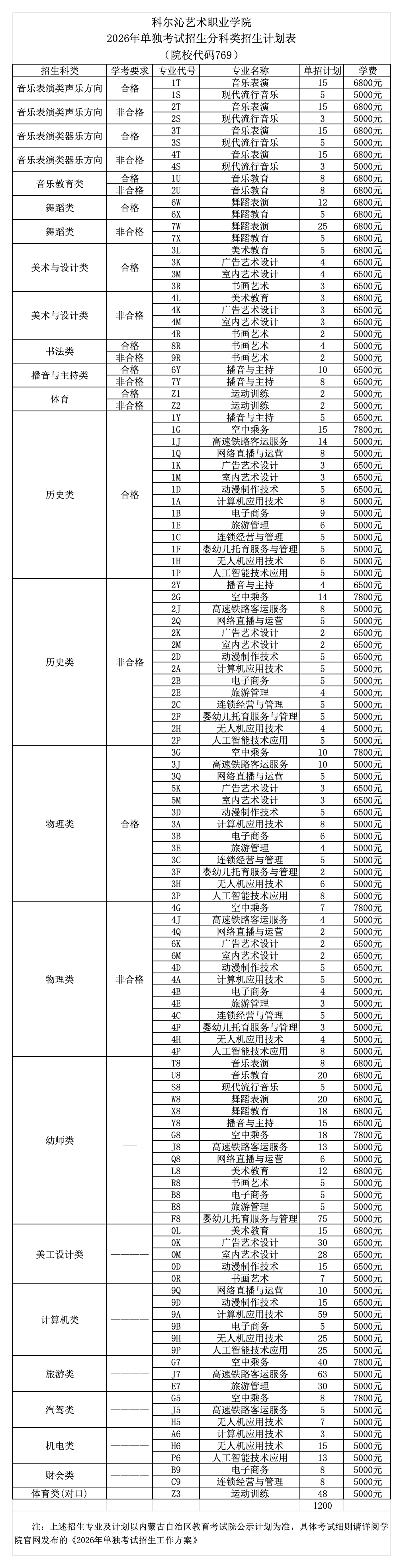科尔沁艺术职业学院2026年单独考试招生分科类招生计划表(院校代码769)