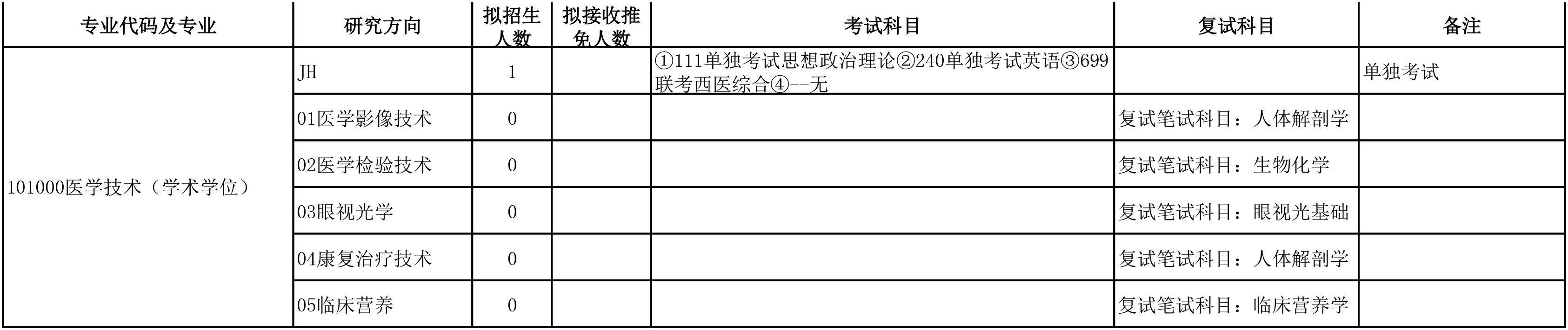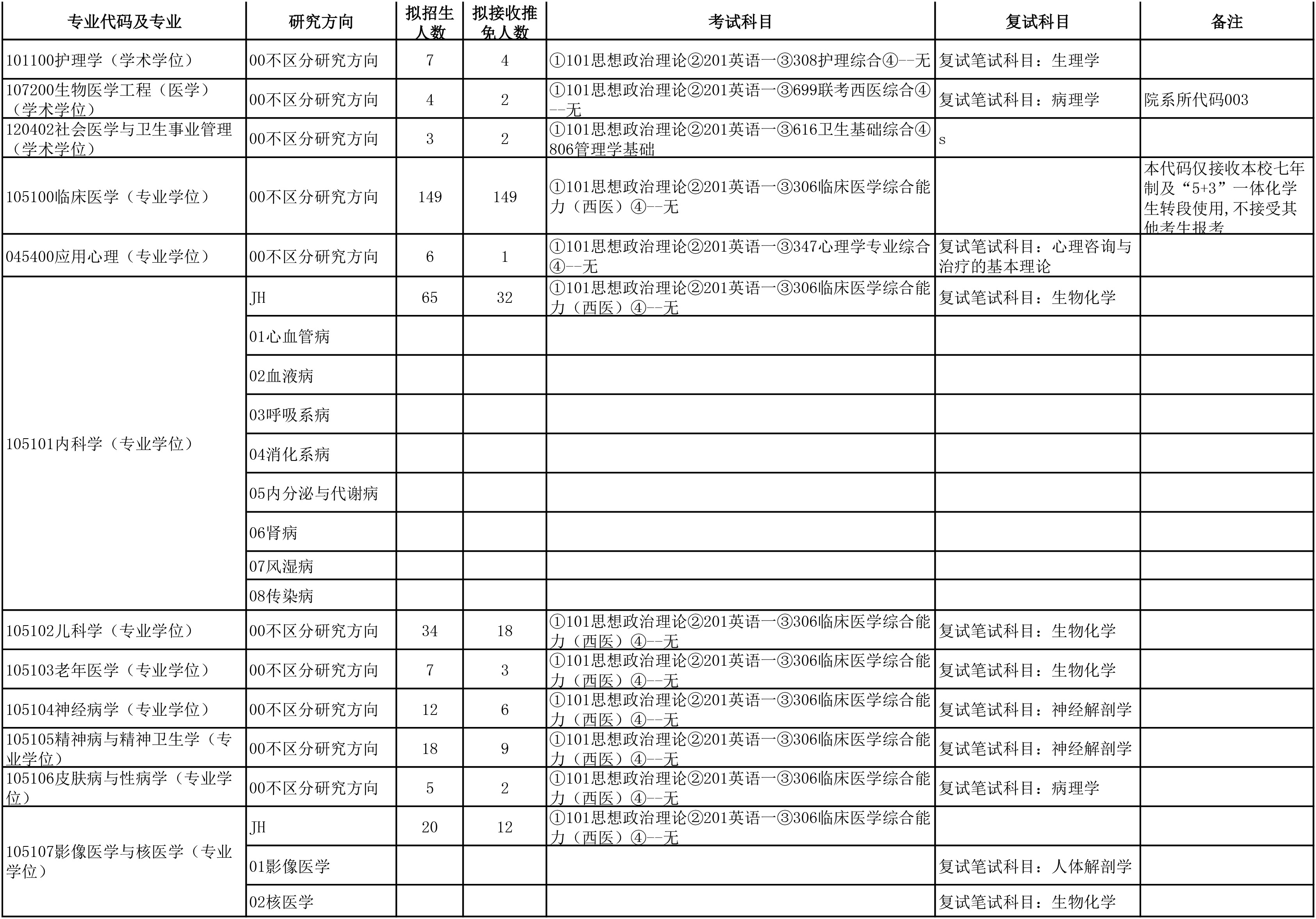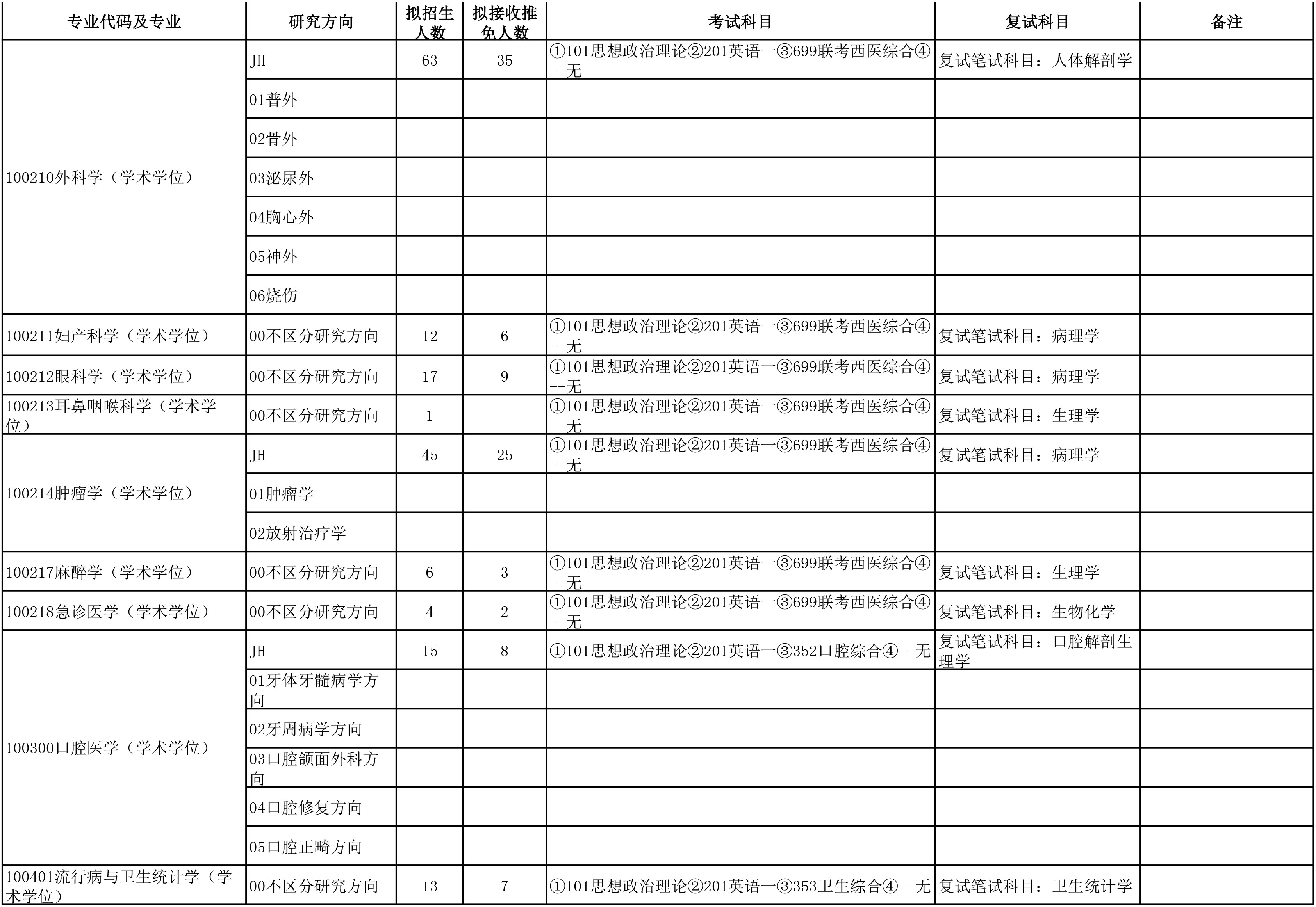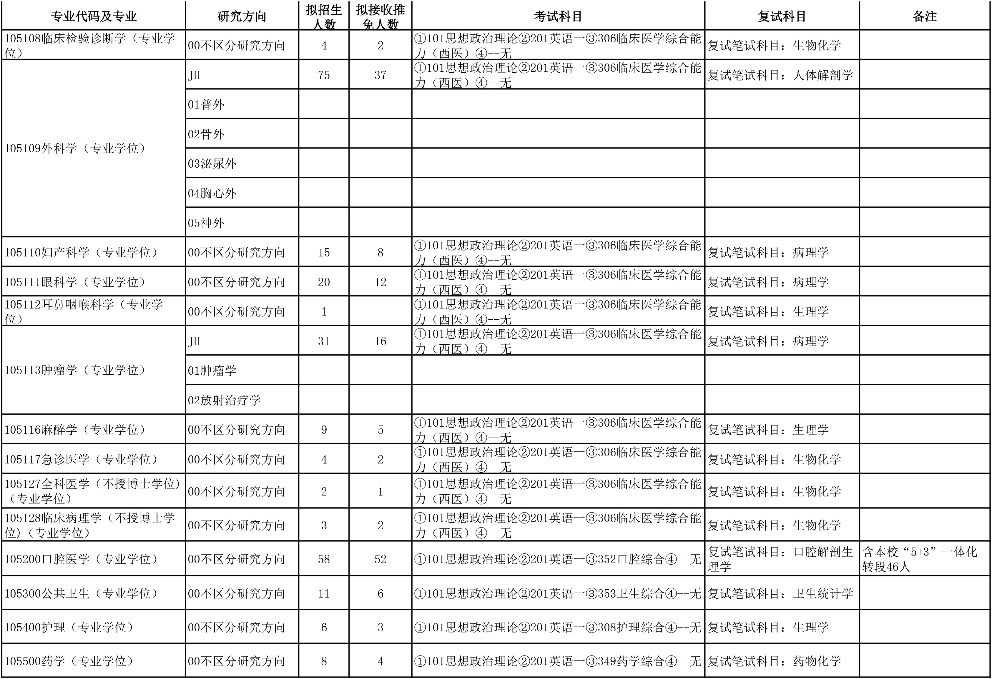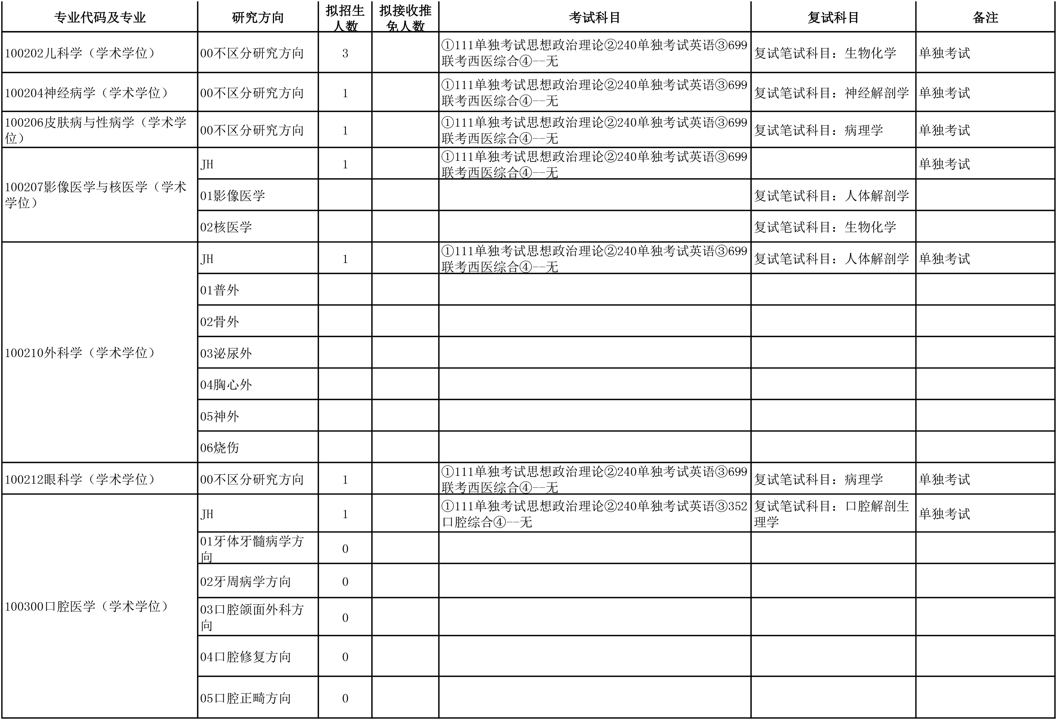 6. 为培养高层次应用型医学人才,我校除学术学位各专业外所有专业学位各专业均接收少数民族高层次骨干人才计划考生报考,但不允许跨专业报考,具体政策按照国家当年招生文件要求执行,各专业(或方向)拟接收人数原则上不超过2人。