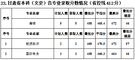 甘肃省本科(文史)各专业录取分数情况(省控线412分)