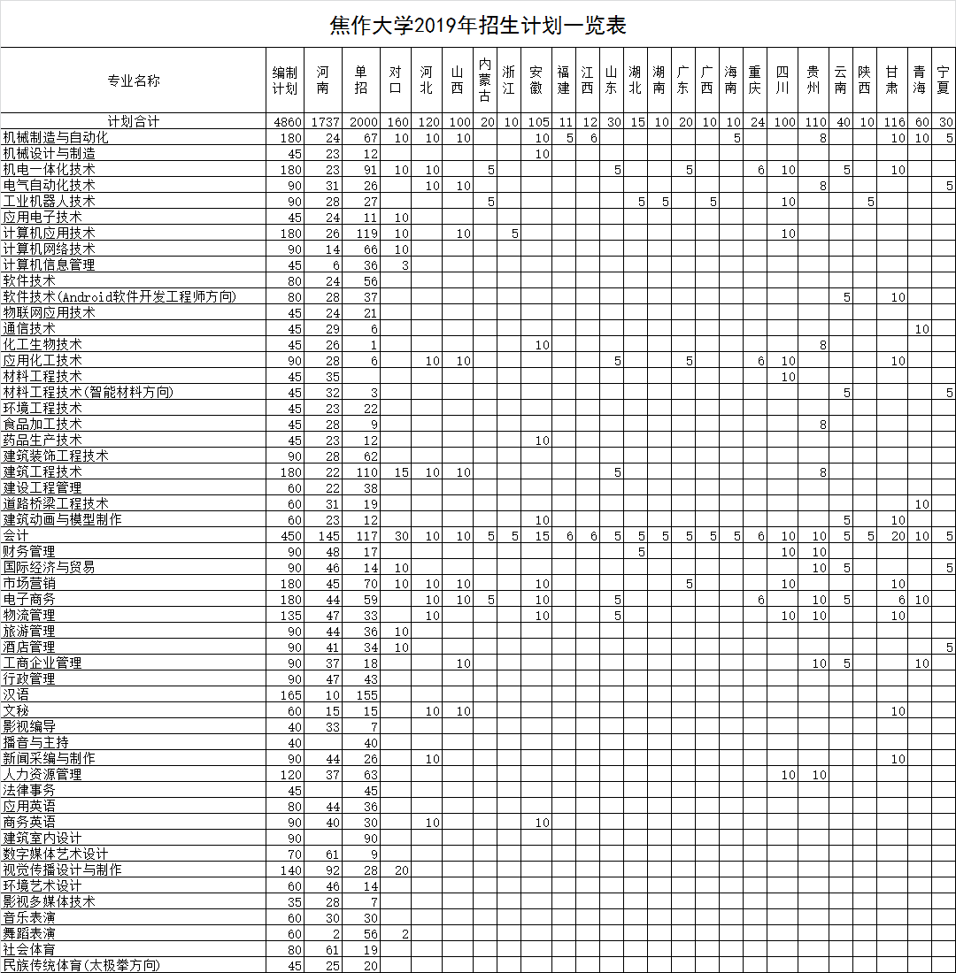 焦作大学2019年招生计划一览表