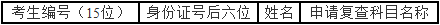 注意:邮件内容可不带表格,按“考生编号(15位);身份证号后六位;姓名;申请复查科目名称”的格式顺序输入即可。