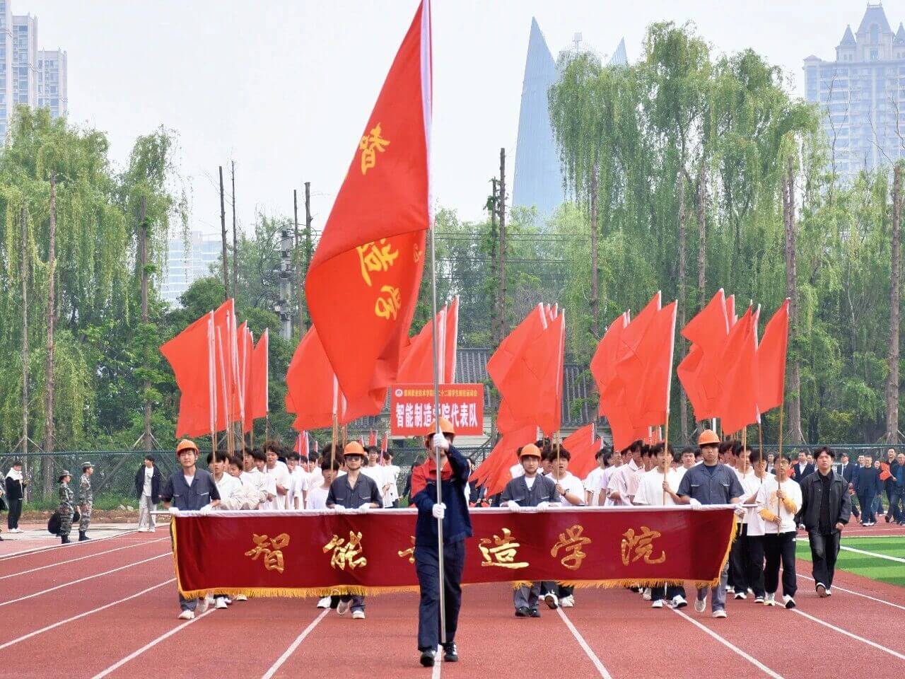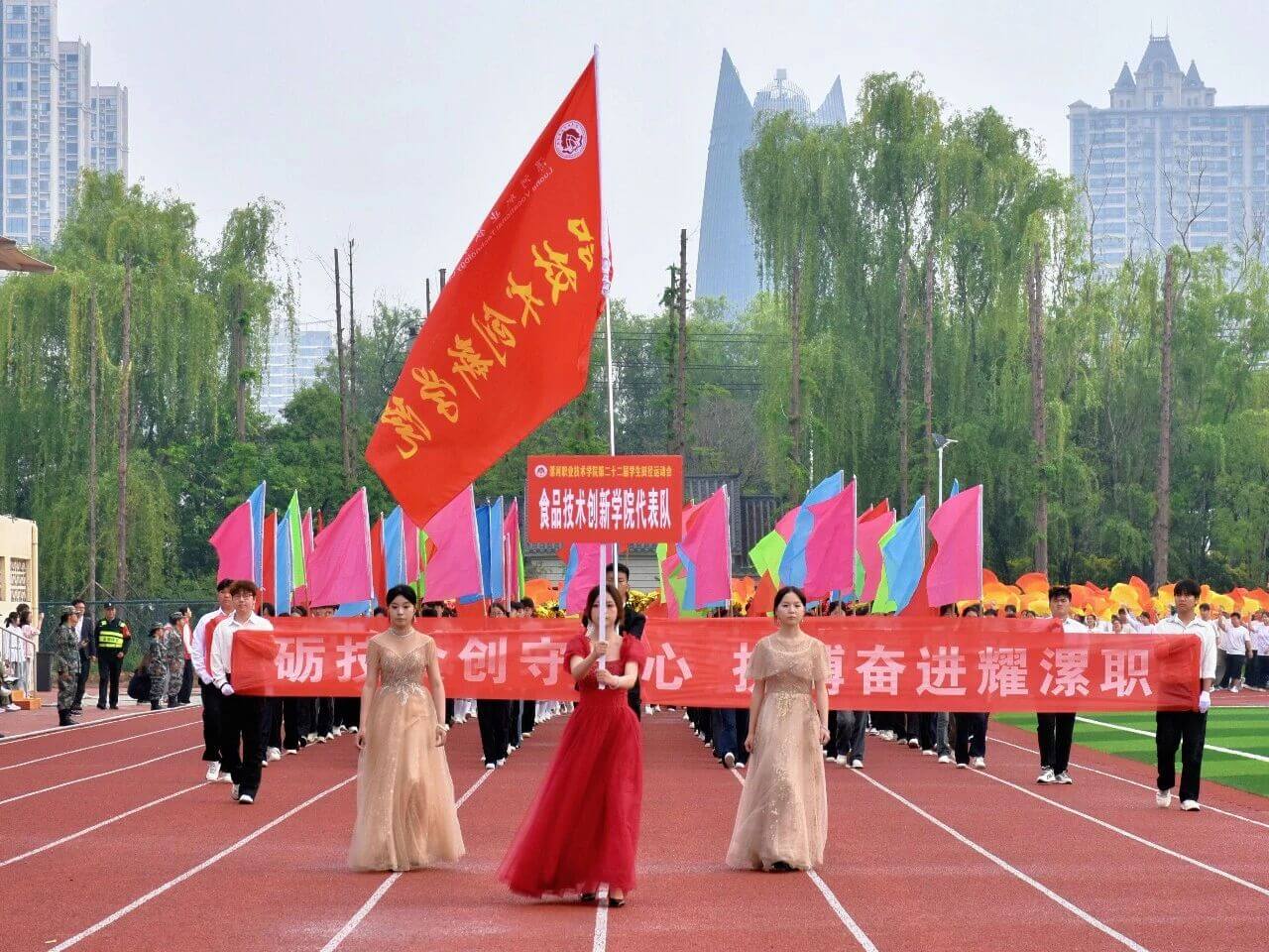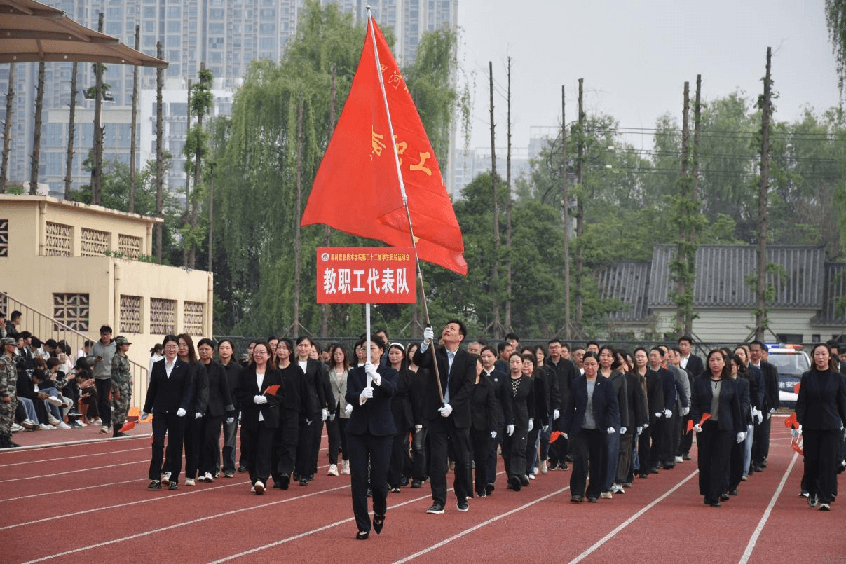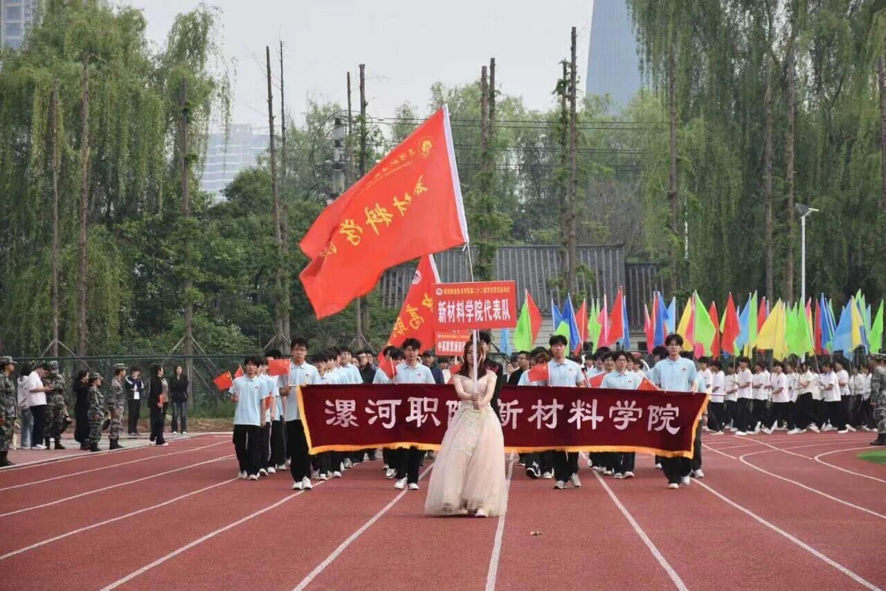 12个二级学院师生组成的方阵依次走过主席台。他们步伐整齐,口号嘹亮,展现了漯职院师生昂扬向上的精神风貌,赢得在场观众的阵阵掌声与喝彩。