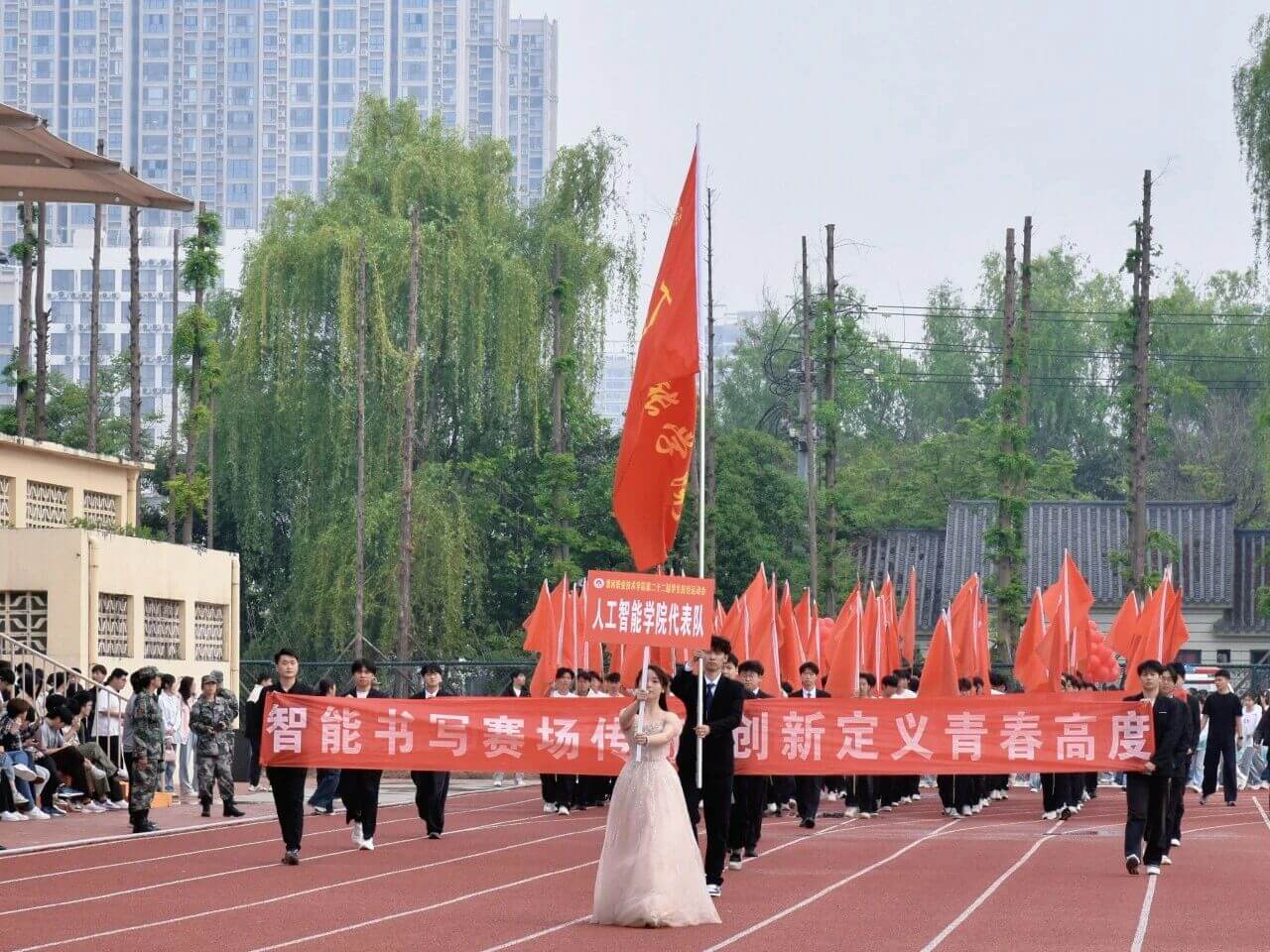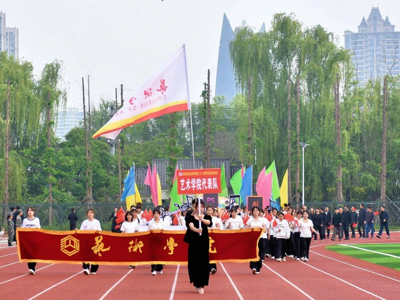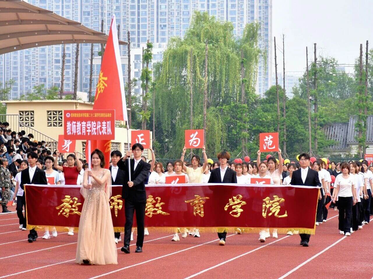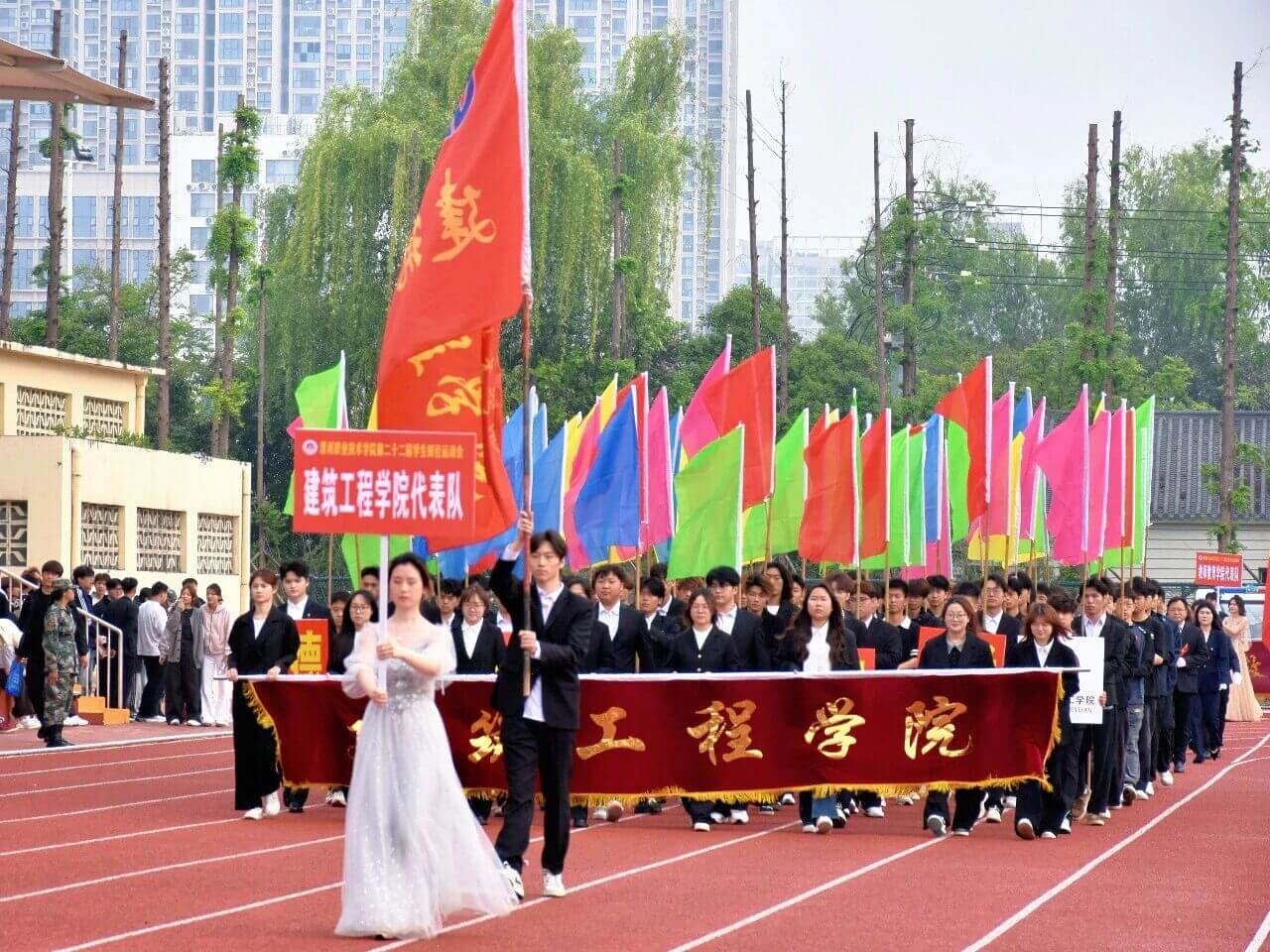 12个二级学院师生组成的方阵依次走过主席台。他们步伐整齐,口号嘹亮,展现了漯职院师生昂扬向上的精神风貌,赢得在场观众的阵阵掌声与喝彩。